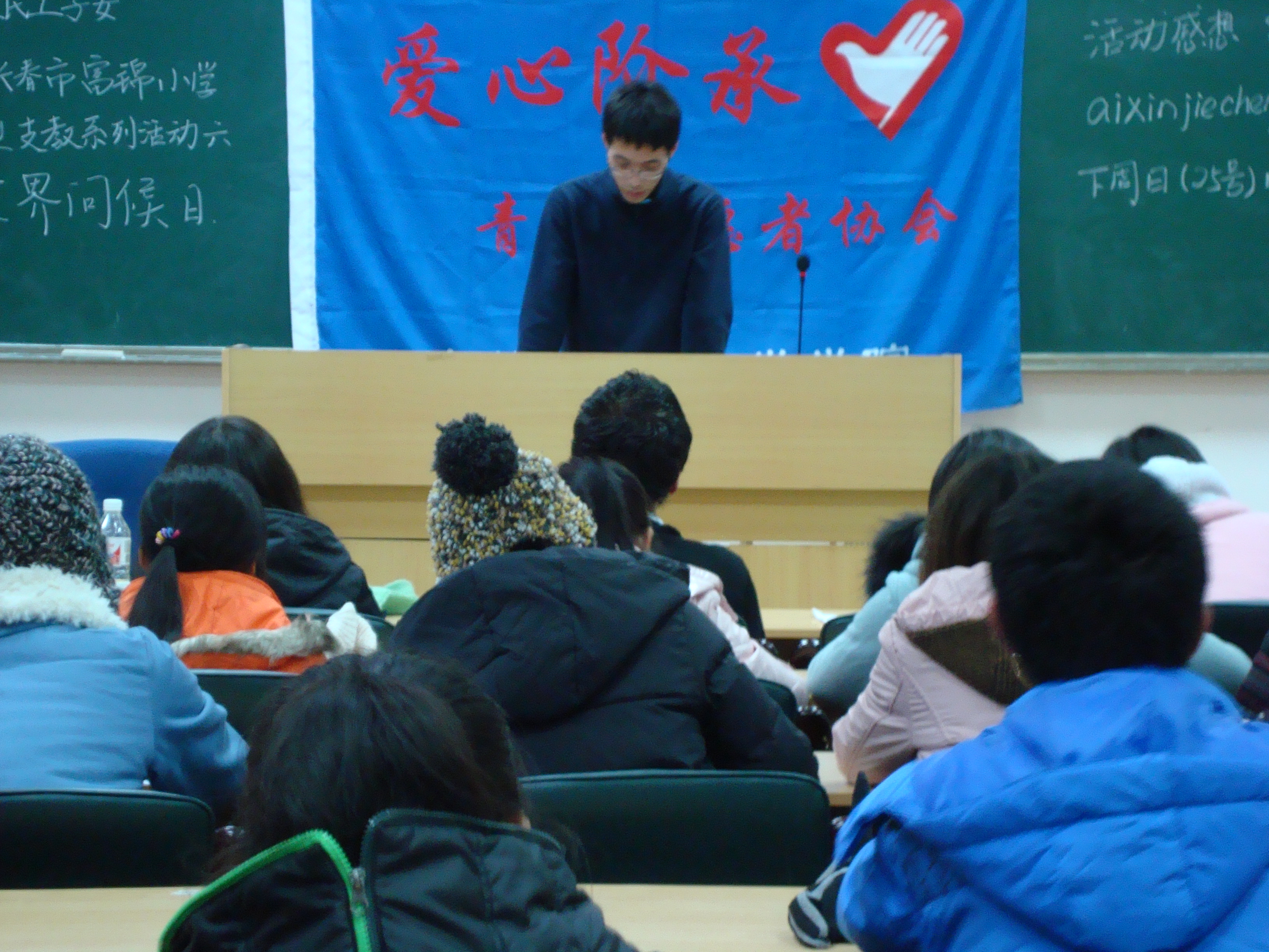 2012年11月15日晚6点,av视频 爱心阶承青年志愿者协会在数学楼一楼报告厅举办了“走进长春市富锦小学--大型支教活动”系列之第六届“世界问候日”主题活动的志愿者培训。