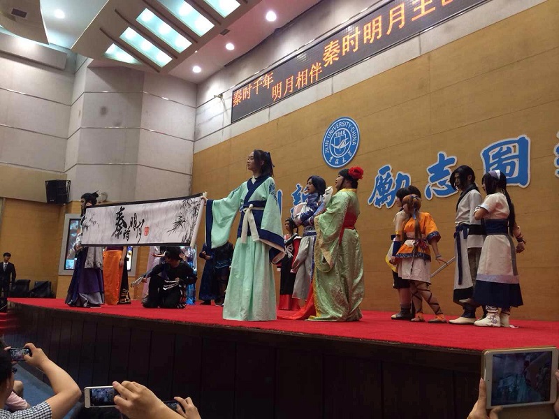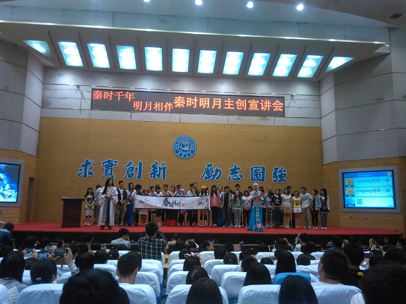 随着化身《秦时明月》剧中高渐离、雪女的主持人入场,备受瞩目的“秦时千里 明月相伴”秦时明月吉大宣讲会于18:00正式开始!一首悠扬的歌曲为观众们开启了如梦似幻的秦时明月Cosplay表演之旅,一舞倾城中的雪女经典动作、盖聂卫庄的巅峰对决,博得了现场满堂喝彩,片中人气角色一一登场,尖叫声不断,随后《秦时明月》TV版经典主题曲《月光》响起,所有coser 以经典pose齐齐亮相,秀出印有“秦时明月”古风字样的水墨条幅,将全场的气氛推向高潮!