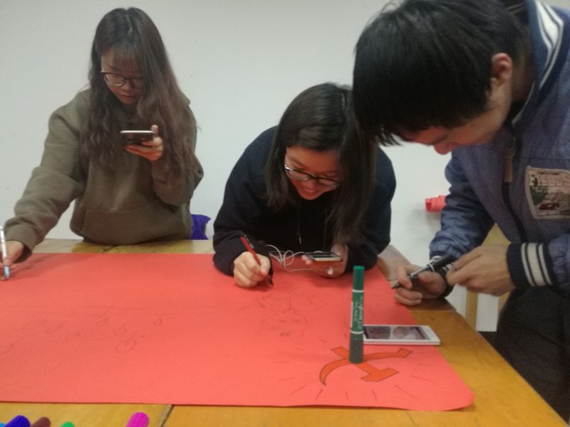 活动一开始,班长组织讲话并宣传了长征精神。随后,在文体副班长讲解完活动的具体内容及评奖要求后,全班以小组的形式开始制作与长征精神有关的板报。接着,由班委进行评定选出最佳小组并进行颁奖。最后由团支书进行表彰并总结发言。