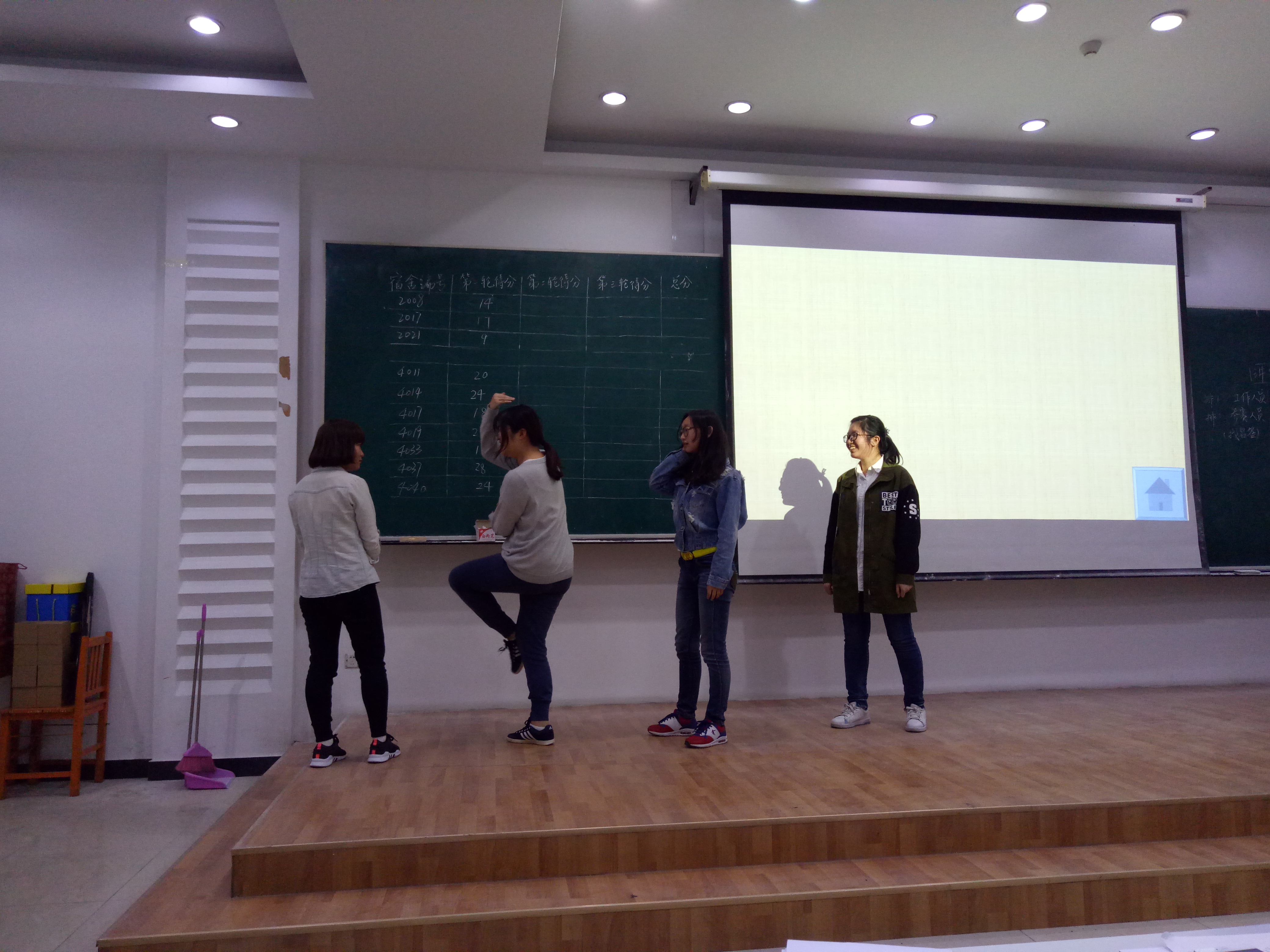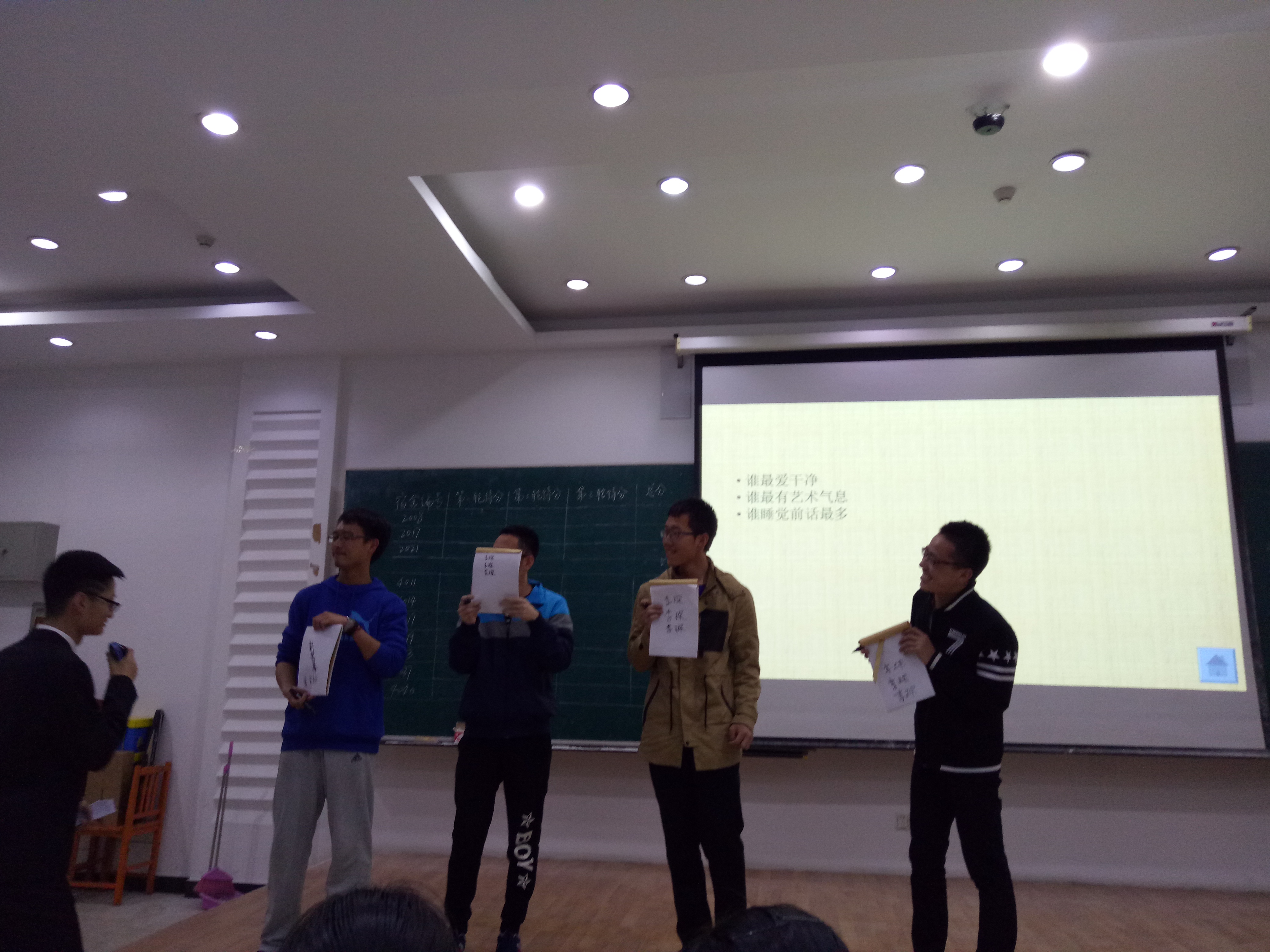 活动共分为四个环节,默契大比拼、你来比划我来猜、歌谣大挑战和关键词小曲库。默契大比拼作为第一个环节充分调动了大家对比赛的积极性。室友四人同时回答PPT亮出的题目,裁判通过他们的回答来判断四人的默契程度。PPT上的问题足以见主办方对本次活动的用心。经过第一轮的比拼,各个队伍的分数不相上下。比赛就这样紧张激烈地进行着。第二环节的你来比划我来猜选手们用尽了浑身解数,现场幽默感十足。第三环节选手们挑战歌曲。在挑战加速歌曲、混音歌曲和空白歌词时各位选手见仁见智,不时赢来观众热烈的掌声。三轮游戏结束后,主持人与观众互动,进行关键词曲库小游戏。主持人给出关键词,唱出含有此关键词的歌曲的观众可获得精美小礼品,大家都踊跃参与。在计分完成后,4019与4037寝室比分相同,进入加时赛环节,轮流回答有关吉大的相关问题,经过激烈的角逐后4037寝室胜出。最终宿舍编号为4014的寝室获得一等奖,4037和4040寝室获得二等奖,4011、4017和4019寝室获得三等奖。