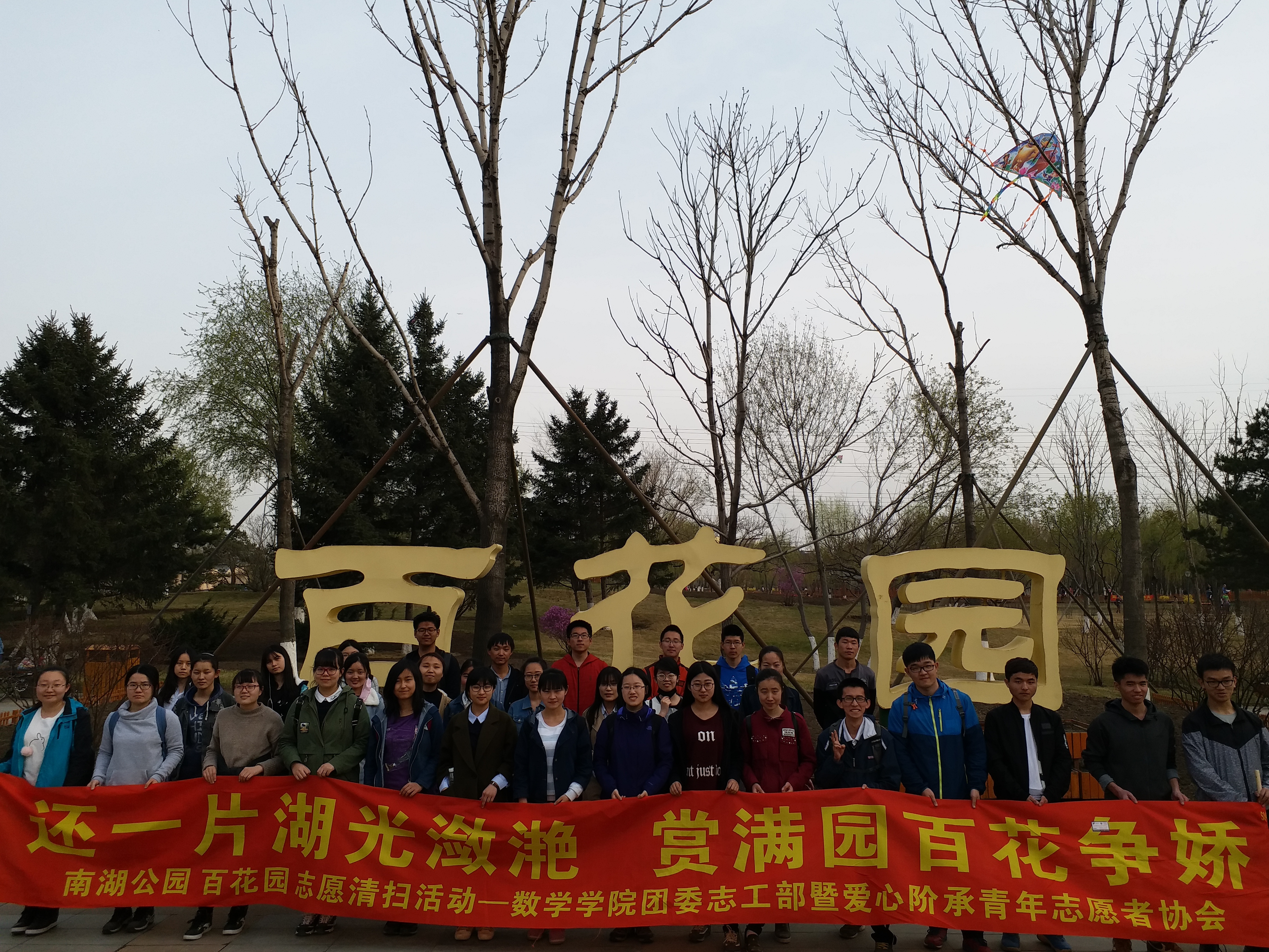 为了增强同学们的环境保护意识,呼吁同学们保护环境,团委志工部暨爱心阶承青年志愿者协会组织开展了志愿清扫活动,活动地点为南湖公园和百花园。