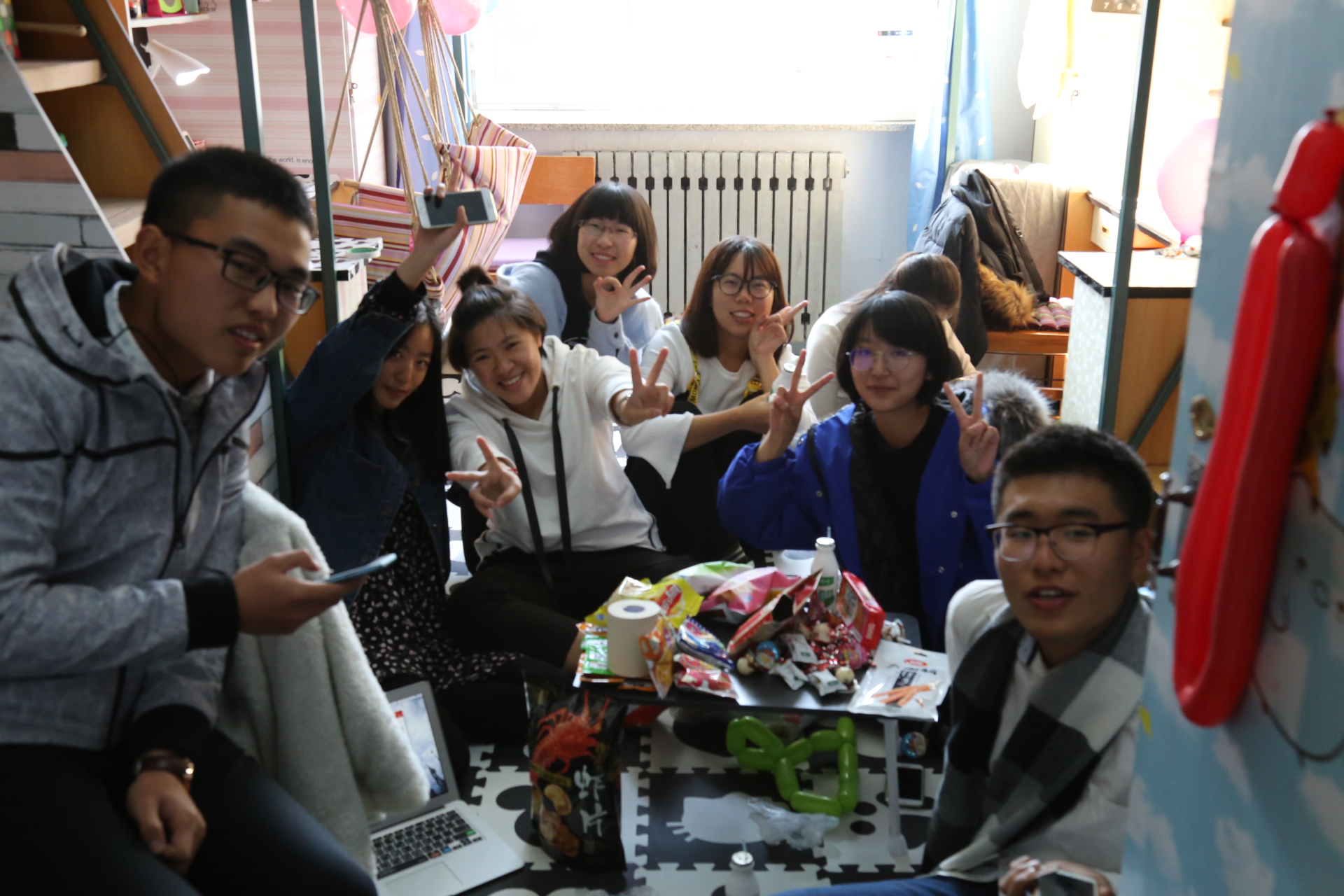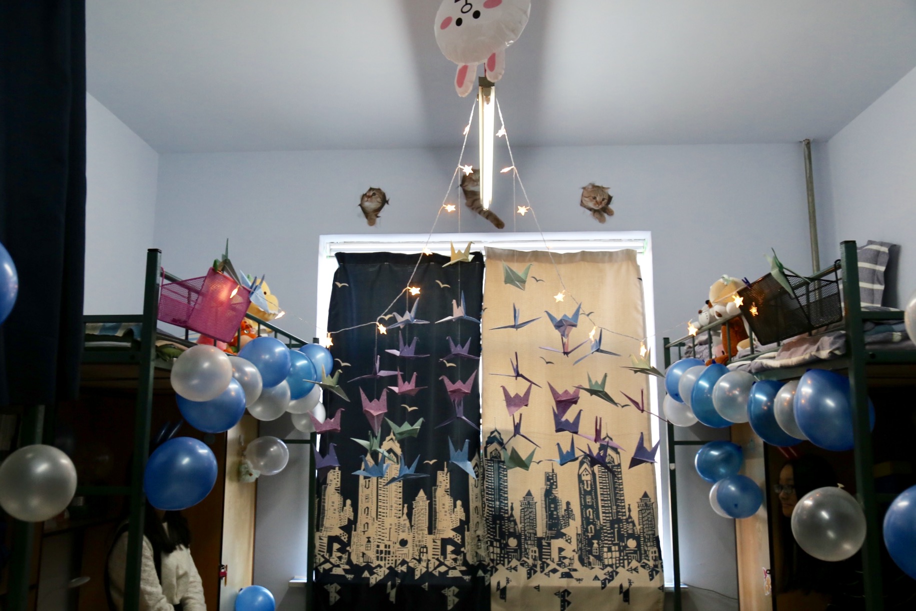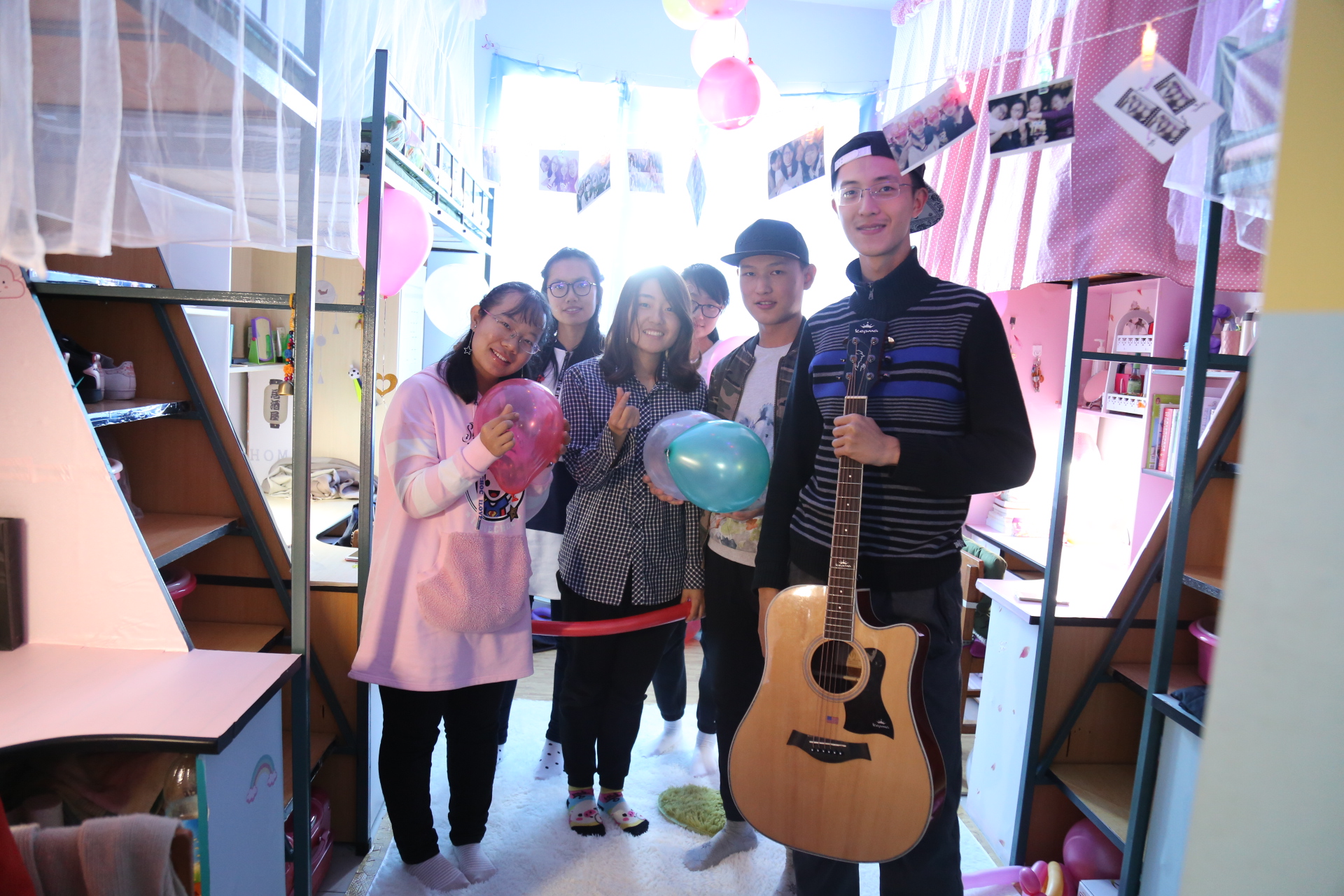 ,有的寝室将气球贴满了天花板,在阳光的影射下显得格外闪耀,有的寝室把千纸鹤串起来,做成了船的形状,高高挂起,也是一道亮丽的风景线。大部分寝室还表演了节目,同学们弹着吉他唱着歌,放着音乐伴着舞,气氛火热,大家都兴致盎然。