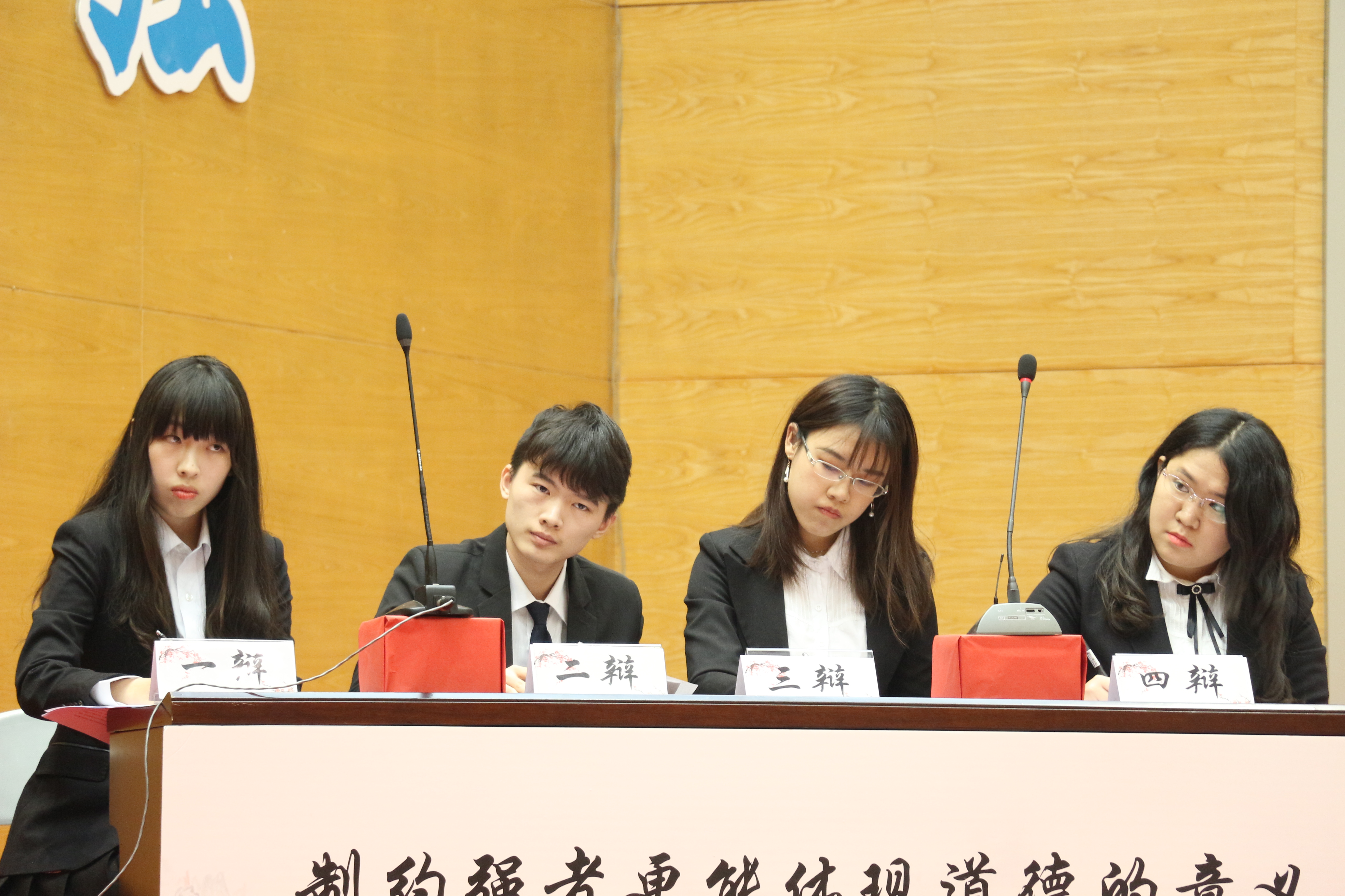 为反方制约强者更能体现道德的意义。我方一辩辛悦开篇立论提出道德的意义在于促进社会和谐发展,并从维护社会秩序,解决社会矛盾,引导正向价值三个方面掷地有声地陈述。我方二辩俞宁宁紧随其后,幽默生动地重申保护和制约的概念,拆解对方观点。应对质询,从容不迫,灵活地化解了对方的进攻。我方三辩程蕾巧妙发问,从动机过程结果三个角度准确地论述了制约强者所能体现出的道德意义。我方四辩刚铭君字字珠玑,鞭辟入里,动之以理晓之以情,一句“不要人夸颜色好,只留清气满乾坤”声震全场,引得掌声雷动。评委老师从学理的角度阐释了对辩题的理解并对场上辩手提出了表扬。在万众期待中,主席宣布结果,av视频