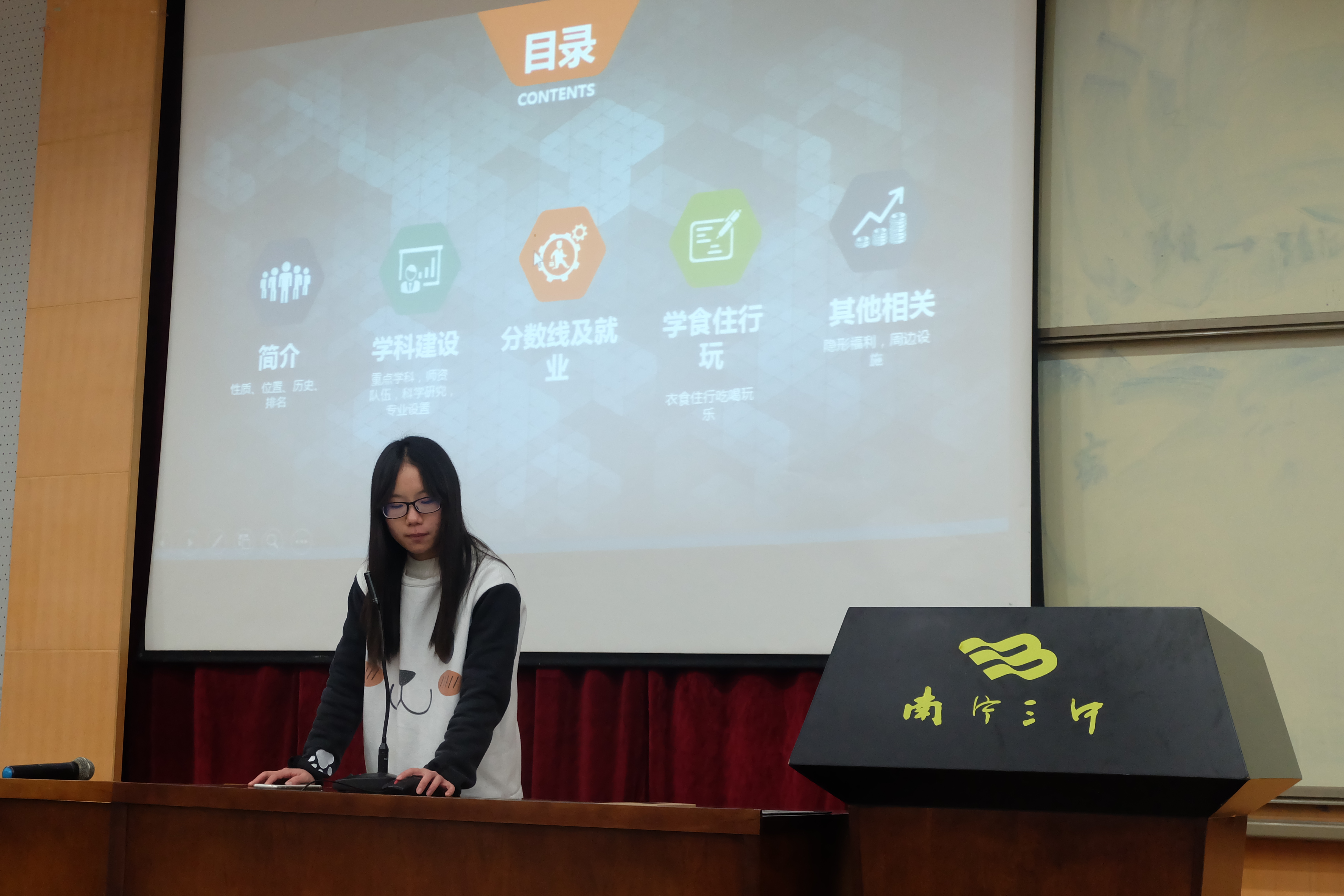 在广西省历年来分数线,很多同学都表示十分感兴趣。除了学科基本情况,队员们在ppt中还就学校的一些其他情况向同学们展示了学校富有韵味的图书馆,一楼高耸的植物令人陶醉,还有风格各异的教学楼,设施完备鼎新楼,吃喝玩乐齐聚的日新楼,游泳馆、健身房和电影院更是极大程度地吸引了学生。