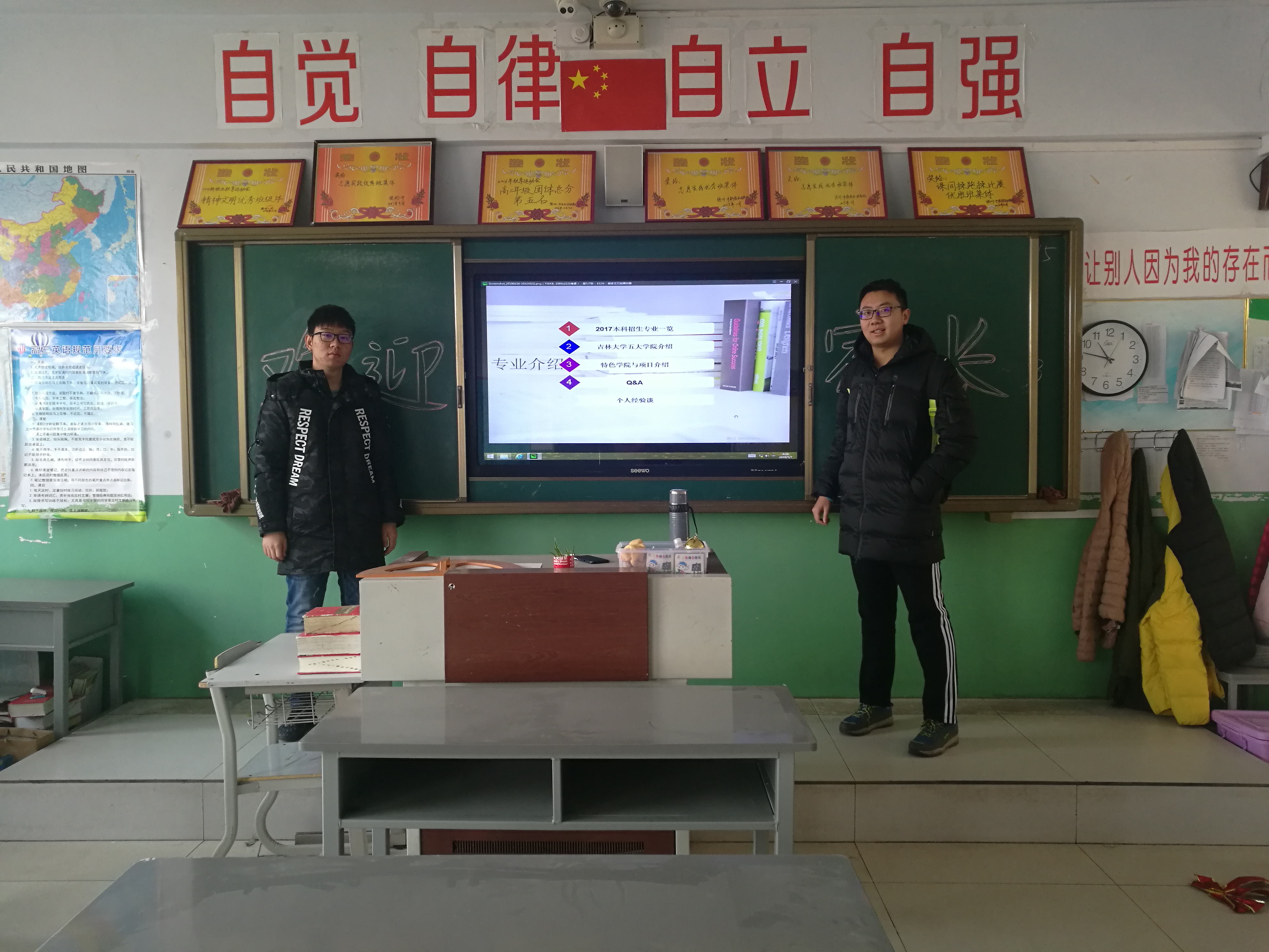 101612团支部在寒假期间分别派出三支宣讲队伍前往江苏省运河中学、山东省德州市第一中学、河北省保定市第一中学进行宣讲。宣讲队成员选择了形式丰富的宣讲形式。队员们首先通过发放宣传单、张贴海报等形式让同学们对我校有了一定了解并激发了同学们对我校的兴趣。在正式宣讲的过程中,队员们提前准备好了PPT、视频等资料,即使现场突发状况无法使用PPT,也利用投影仪将手机中的吉大美景放给大家看。队员们从av视频