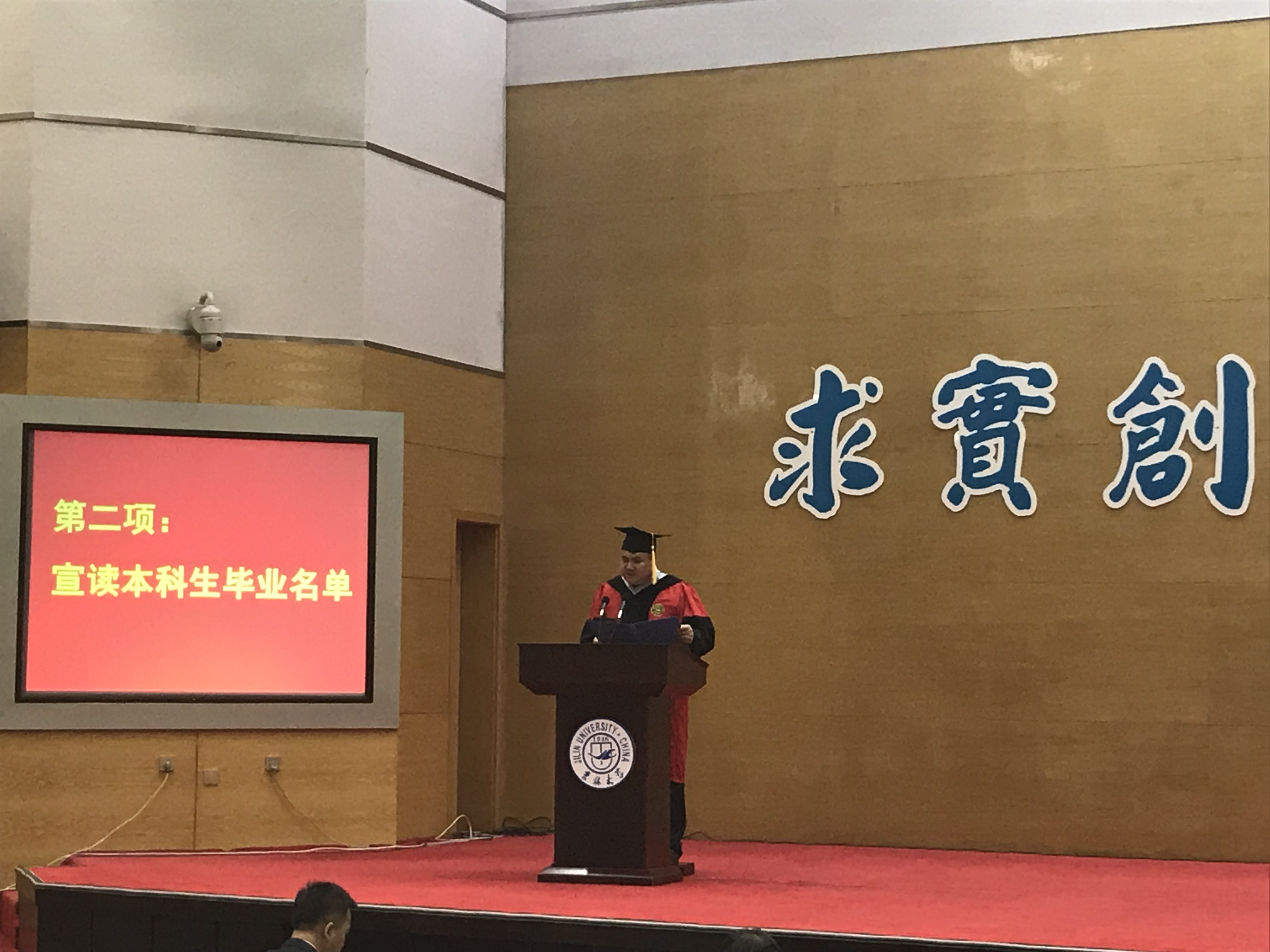 大会首先由副院长王德辉教授和史少云教授老师分别宣读了获得学士学位、硕士学位以及博士学位的毕业生名单。接着,党委副书记王欢老师宣读2018届优秀毕业生表彰决定,并党委书记李晓光教授为获奖代表颁发证书。
