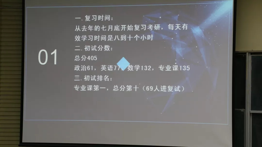 学生会学习部4月10日晚六点在逸夫楼五阶教室举办了考研经验交流会,邀请了辛悦、单瑞彤、陈兆阳、李鹏飞、刘博、胡锦旭、潘超、厍馨予、董倩、隋尚廷、闵鹏瑾、庄珊珊、王晗13位取得优异考研成绩的学长学姐分享了考研的经验和技巧。会上,辅导员李庚老师也表达了自己对同学们寄予了殷切的希望,并为同学们出谋划策、加油鼓劲。