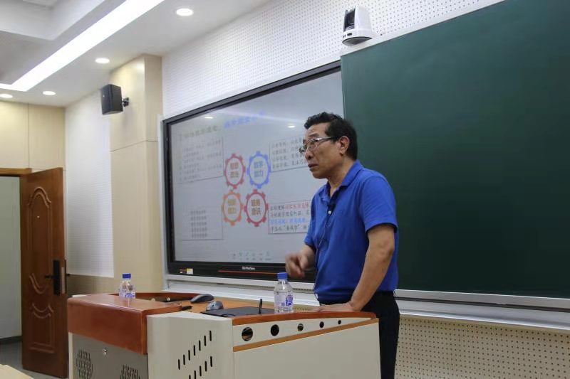 李辉来教授做报告,报告内容是关于一流课程申报及数学课程思政建设指导。在“一流课程建设之理念与实践”报告中,李老师从课程的核心要素与总体设计、明确教学理念提升师资水平、丰富教学过程改革教学方法、创新教学模式完善教学层次、施行综合考核科学评价成效、教书育人并举建好资源平台六个方面深刻阐述了以学生为主体,以教师为主导的教学理念内涵,在教学活动中实现因材施教、因层施教、因类施教、因形施教,从而让学生从“要我学”转变为“我要学”。积极创新教学模式,围绕应用问题开展研究式教学、围绕数学方法开展讨论式教学、围绕数学发现开展探索式教学、围绕科学素质开展讲座式教学、围绕课程思政开展融入式教学。李老师鼓励青年教师以“大德无形”的境界,强化品德修为,加强师德修养;以“大学无涯”的追求,练就过硬本领,担当时代责任;以“大爱无疆”的仁心,关心学生成长,潜心立德树人。在“数学课程思政体系研究”报告中,李老师从国之大计、研究内容、思路方法、预期成效四个方面阐述了课程思政是以马克思主义理论为指导,以育人作为最终目标,以教学课程为主要渠道,通过统筹设计、运行、管理和评价等方面资源,提升教师价值观渗透意识和渗透能力的思想政治教育活动。
