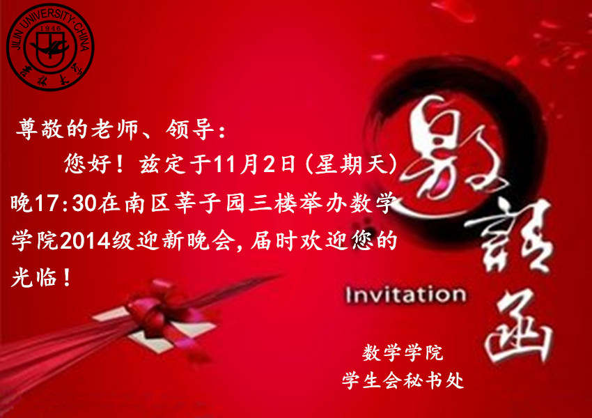 尊敬的老师、领导: 您好!兹定于11月2日(星期日)晚15:30分在南区莘子园三楼举办av视频 2014级迎新晚会,届时欢迎您的光临! av视频 学生会秘书处