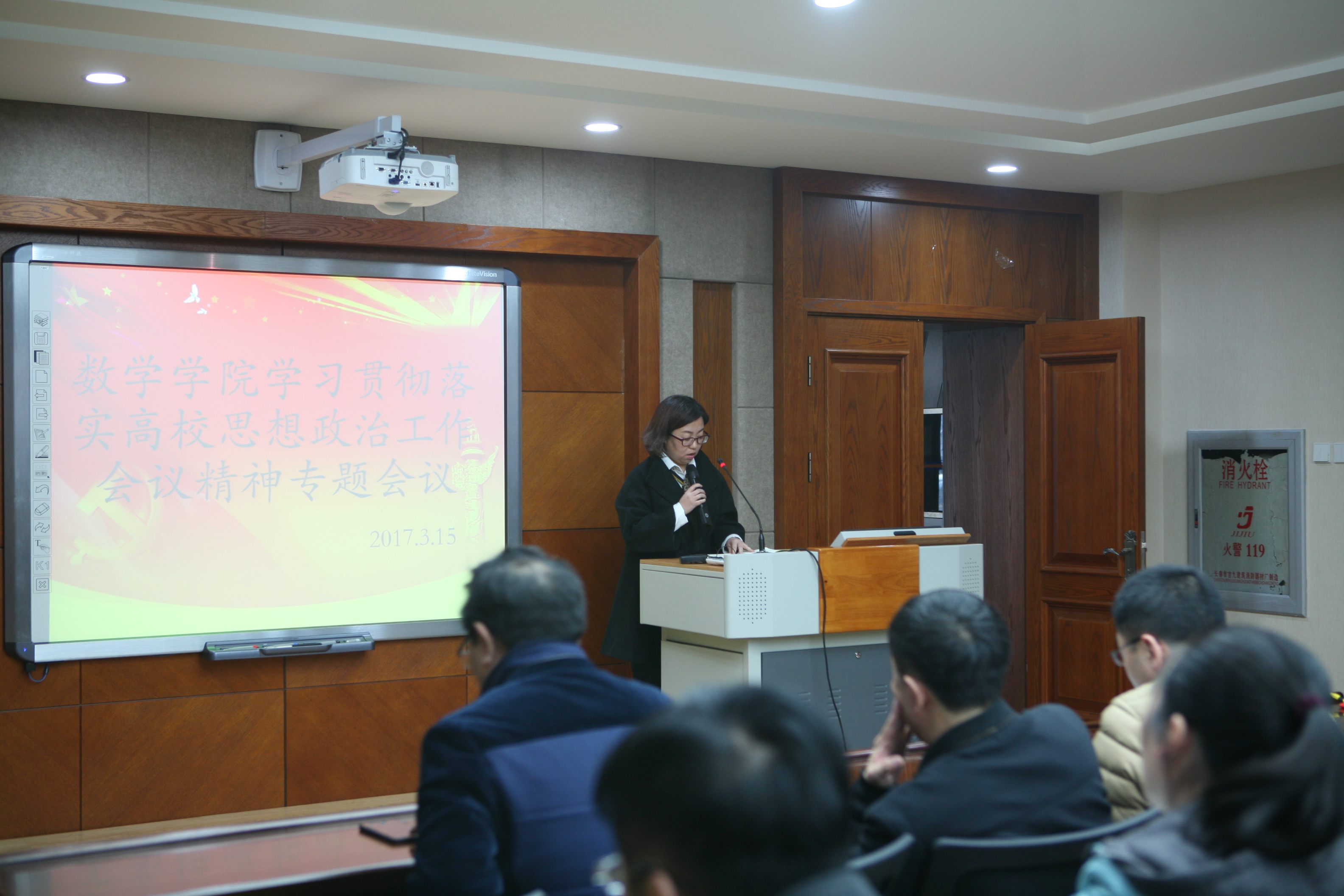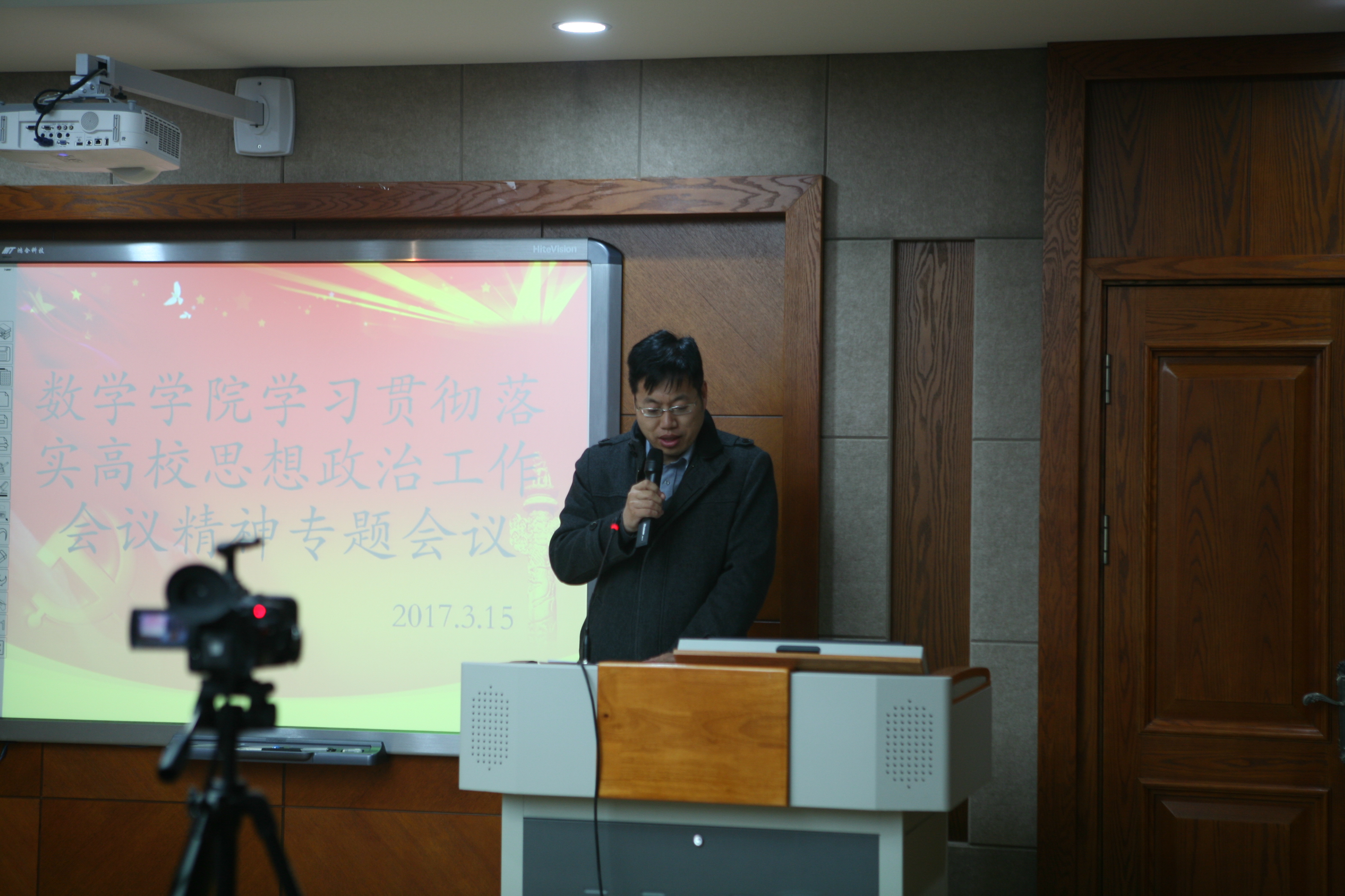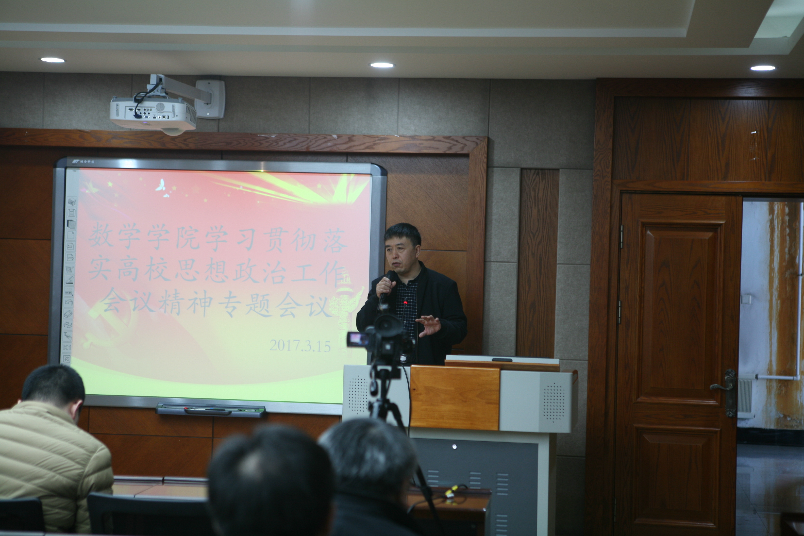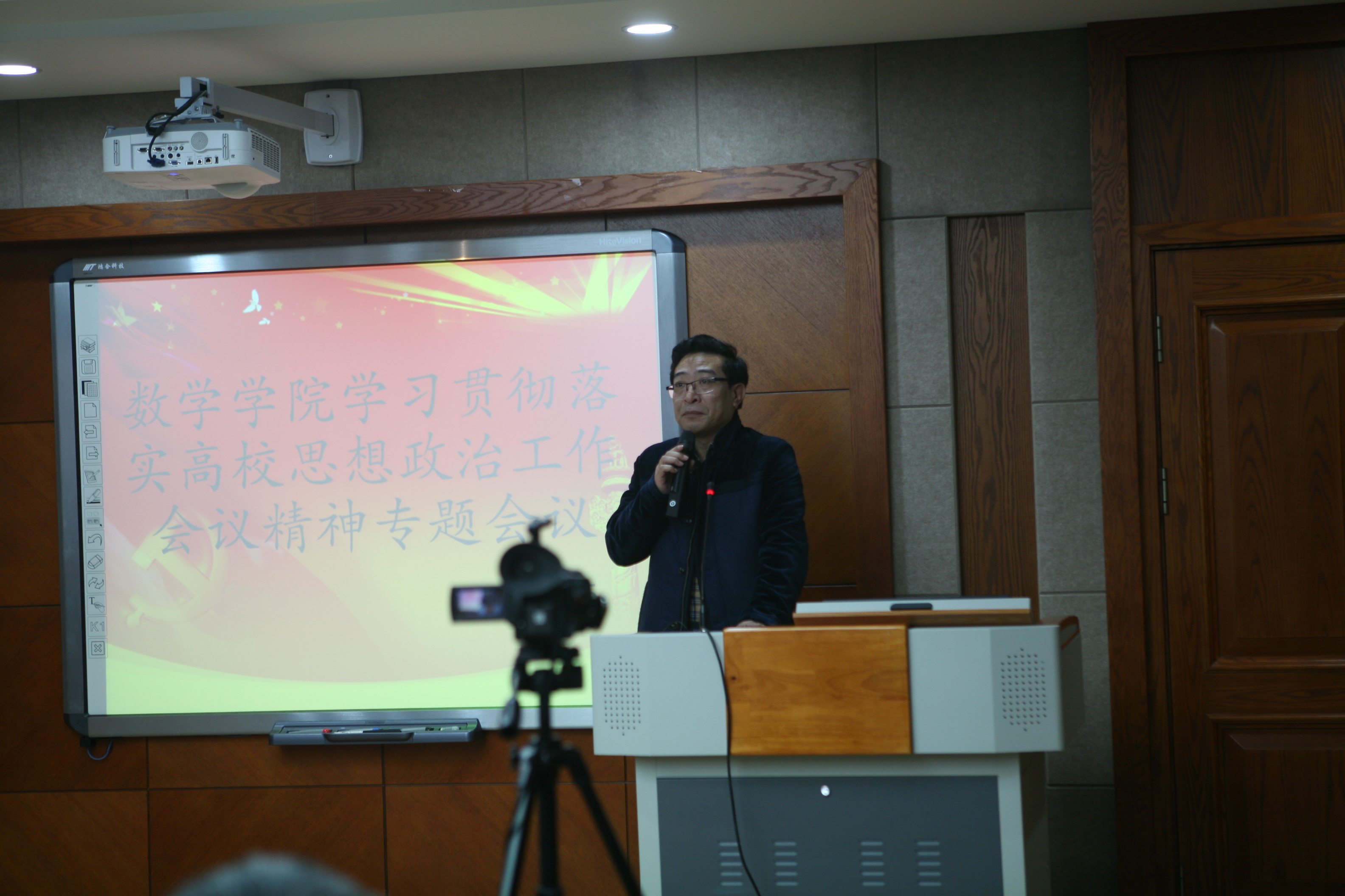 在数学楼一楼报告厅召开全院教职工大会,专题学习和传达全国高校思想政治工作会议精神。会议由院长李辉来同志主持。