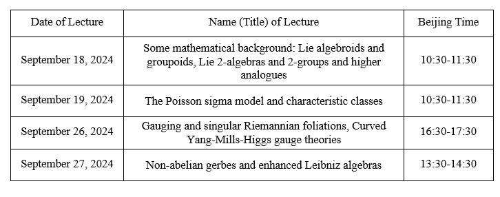 报告人简介: Thomas Strobl is a professor in the mathematics department at the University of Lyon. His work as a mathematical physicist is mainly concerned with geometric and algebraic aspects of sigma models and gauge theories. In 1993, during his PhD thesis and together with P. Schaller, he discovered the Poisson Sigma Model; it was used later by M. Kontsevich to obtain his famous quantization formula. In 2015 he and A. Kotov introduced a generalisation of Yang-Mills gauge theories to the Lie algebroid setting. In total, in his career he authored more than 60 scientific articles.