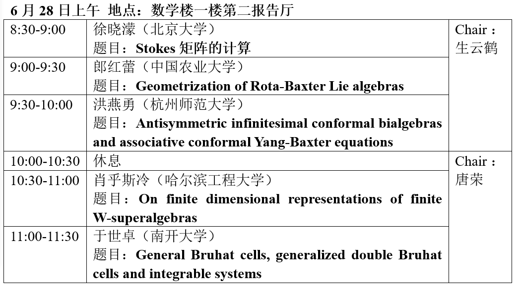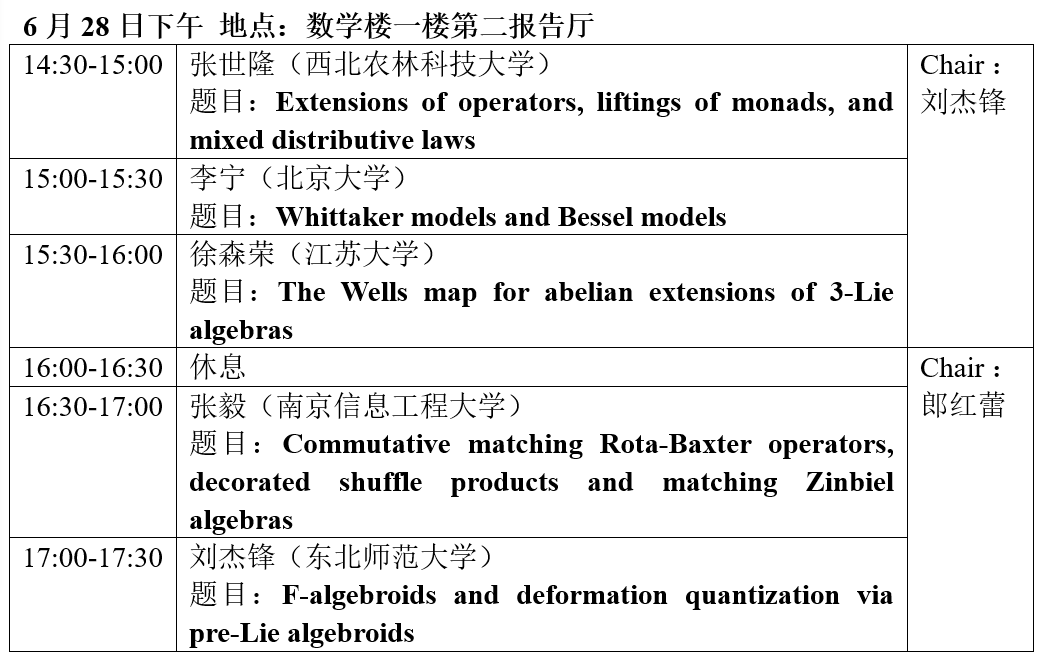 召开“Poisson几何与Rota-Baxter代数研讨会”。会议主要邀请北京大学、南开大学、中国农业大学、哈尔滨工程大学、西北农林科技大学,杭州师范大学,南京信息工程大学,江苏大学,东北师范大学等专家学者参加,并作专题学术报告。参加会议的还有本院教师及相关专业的博士生、硕士生。欢迎对此会议感兴趣的老师前来报名参加。