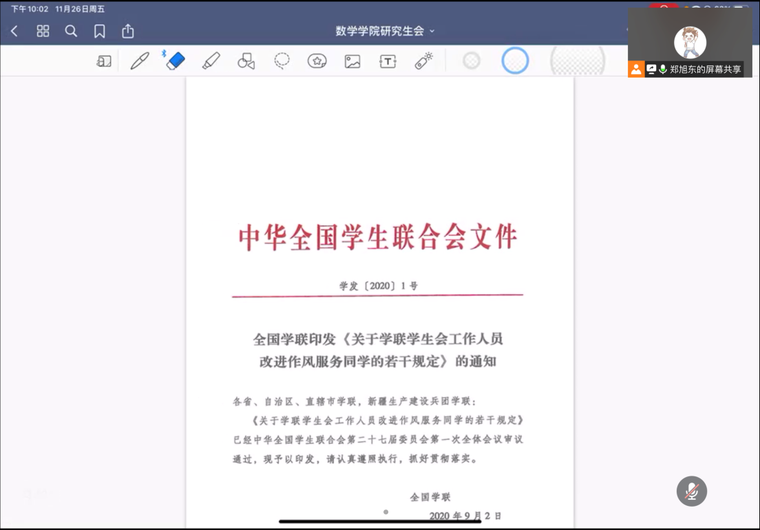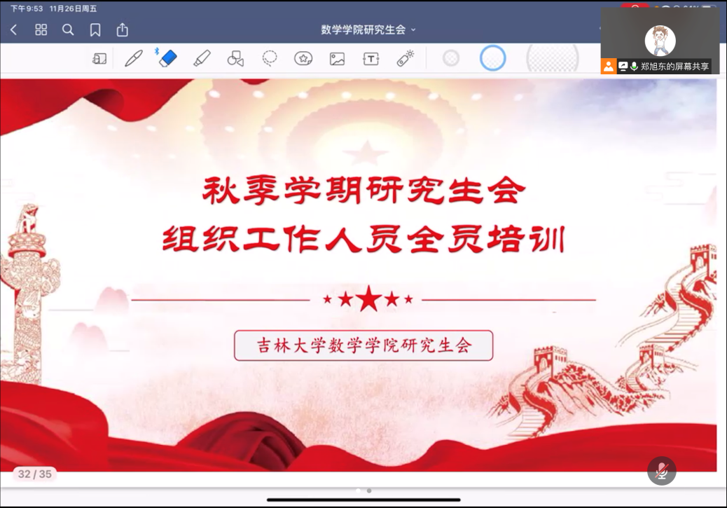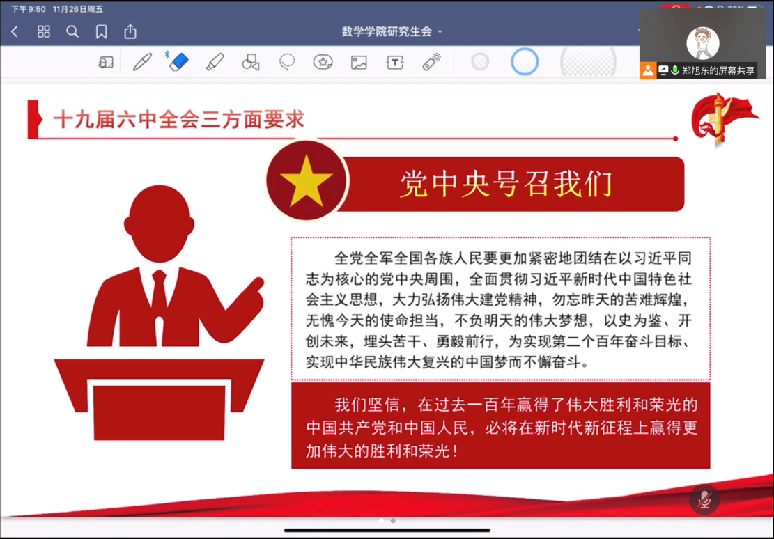 为进一步加强我院研究生会队伍建设,切实发挥学生骨干在“自我管理、自我教育、自我服务”中的作用,培养和选拔一支“政治素质过硬、服务意识突出、工作态度优异、业务素质精湛”的研究生会工作人员队伍,11月26日,av视频 研究生会于线上举办了2021-2022学年秋季学期研究生会组织工作人员全员培训会暨党的十九届六中全会精神学习研讨会,学院研究生会执行主席郑旭东主持会议,学院研究生会全体成员出席会议。