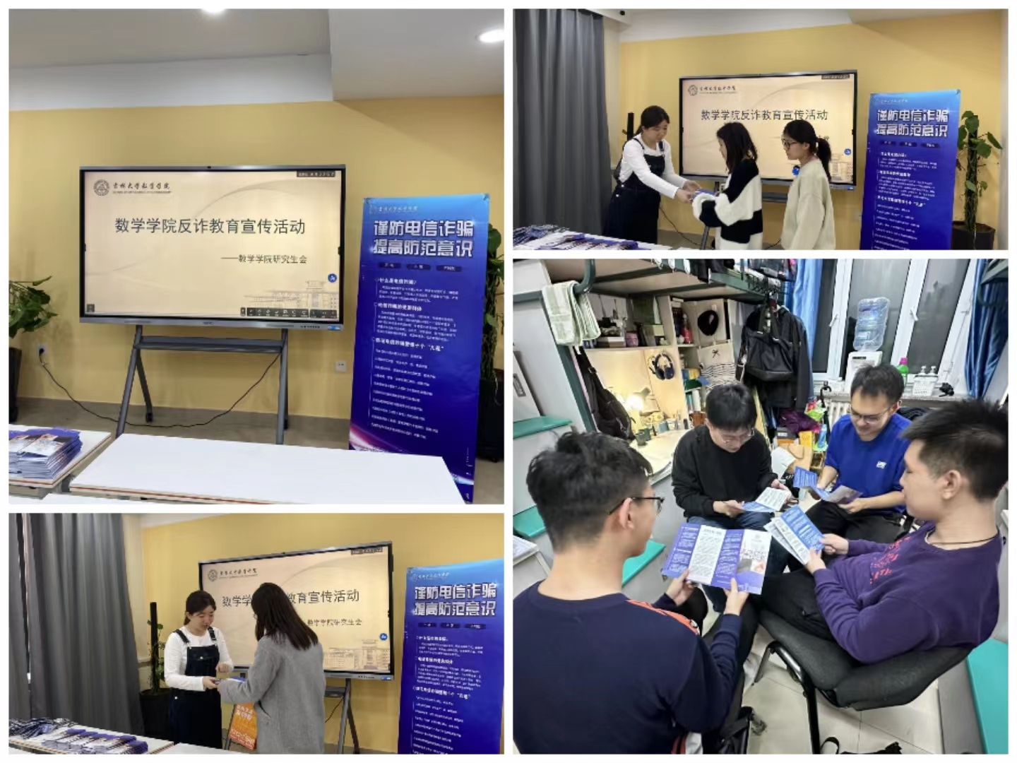 学院研究生会制作了反诈折页和展板海报向同学们普及反诈知识,从近期涉校案件实例切入,围绕“什么是网络诈骗”“哪些是易骗类型”“我们应该怎么做”,深入讲解了典型诈骗案例,深刻揭露了网络诈骗的特点、类型、手段及危害,详细说明了应对诈骗的方法和措施,提醒同学们做到“不听、不信、不转账”,提醒同学们安装“国家反诈中心”APP,增强反诈意识和能力。