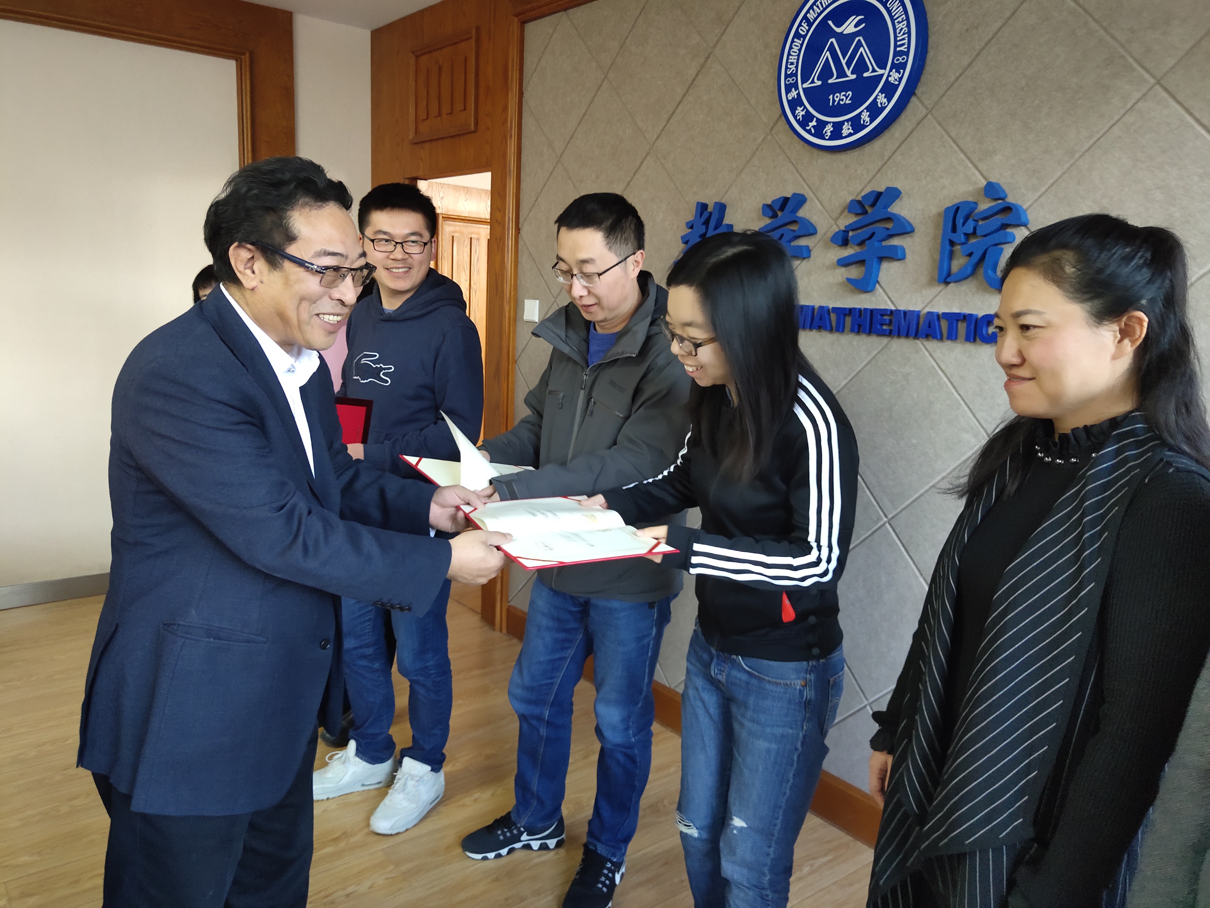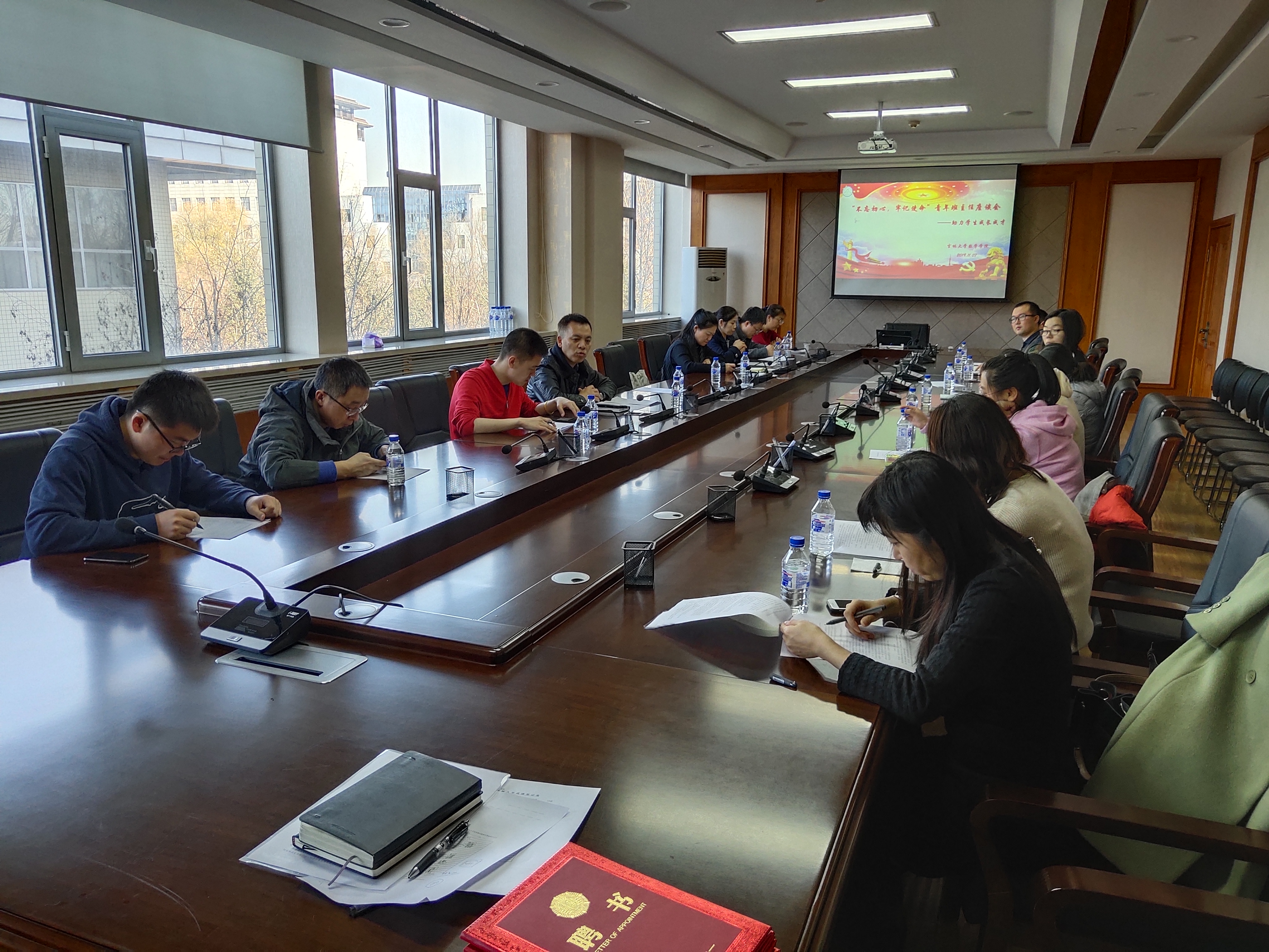 会议第二项,由李辉来院长为各位优秀青年班主任颁发学院聘书。现场气氛活跃,各位班主任老师与院长热情的握手,院长也一一向各位老师表达了自己的祝福和勉励。