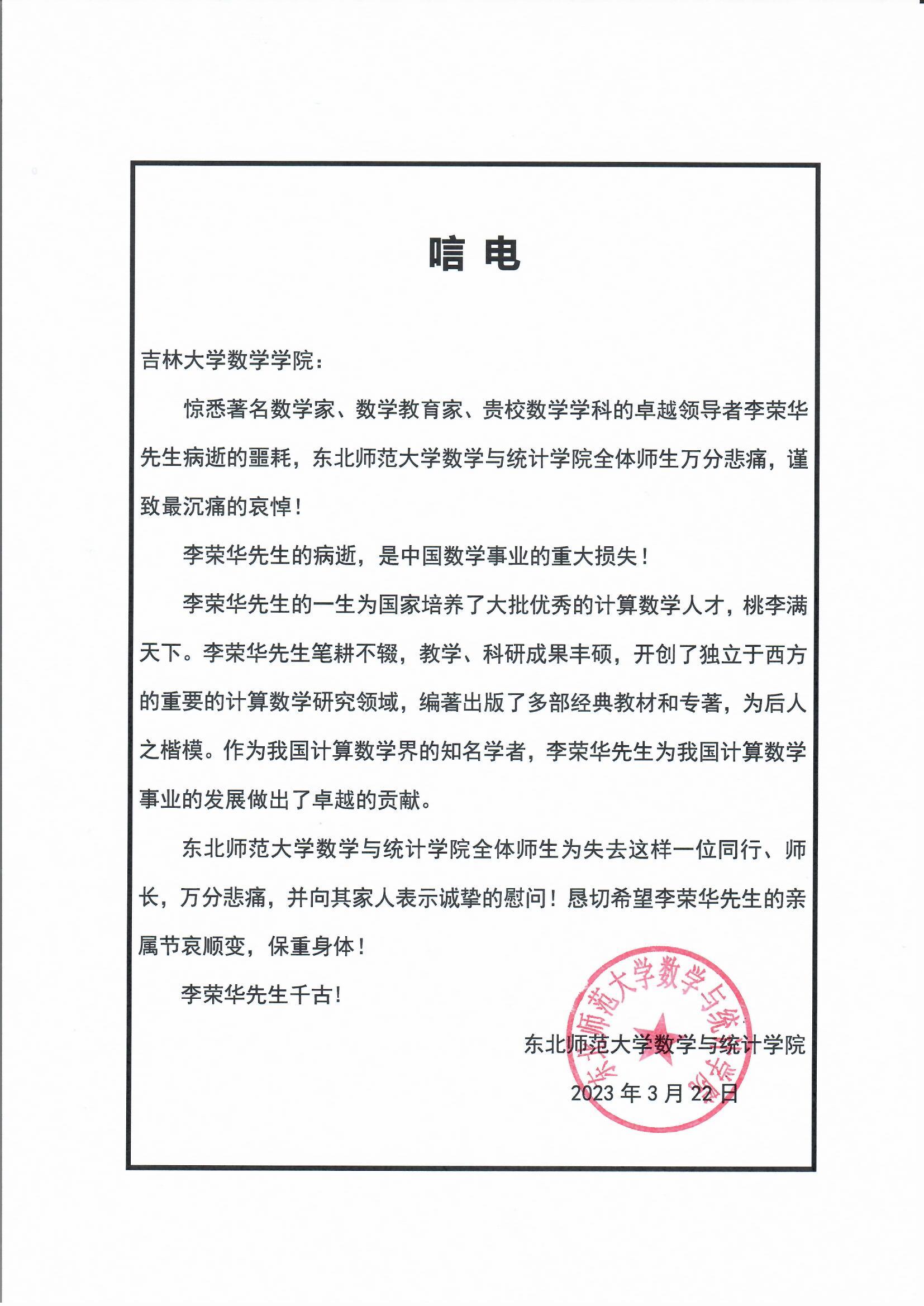 东北师范大学数学与统计学院唁电