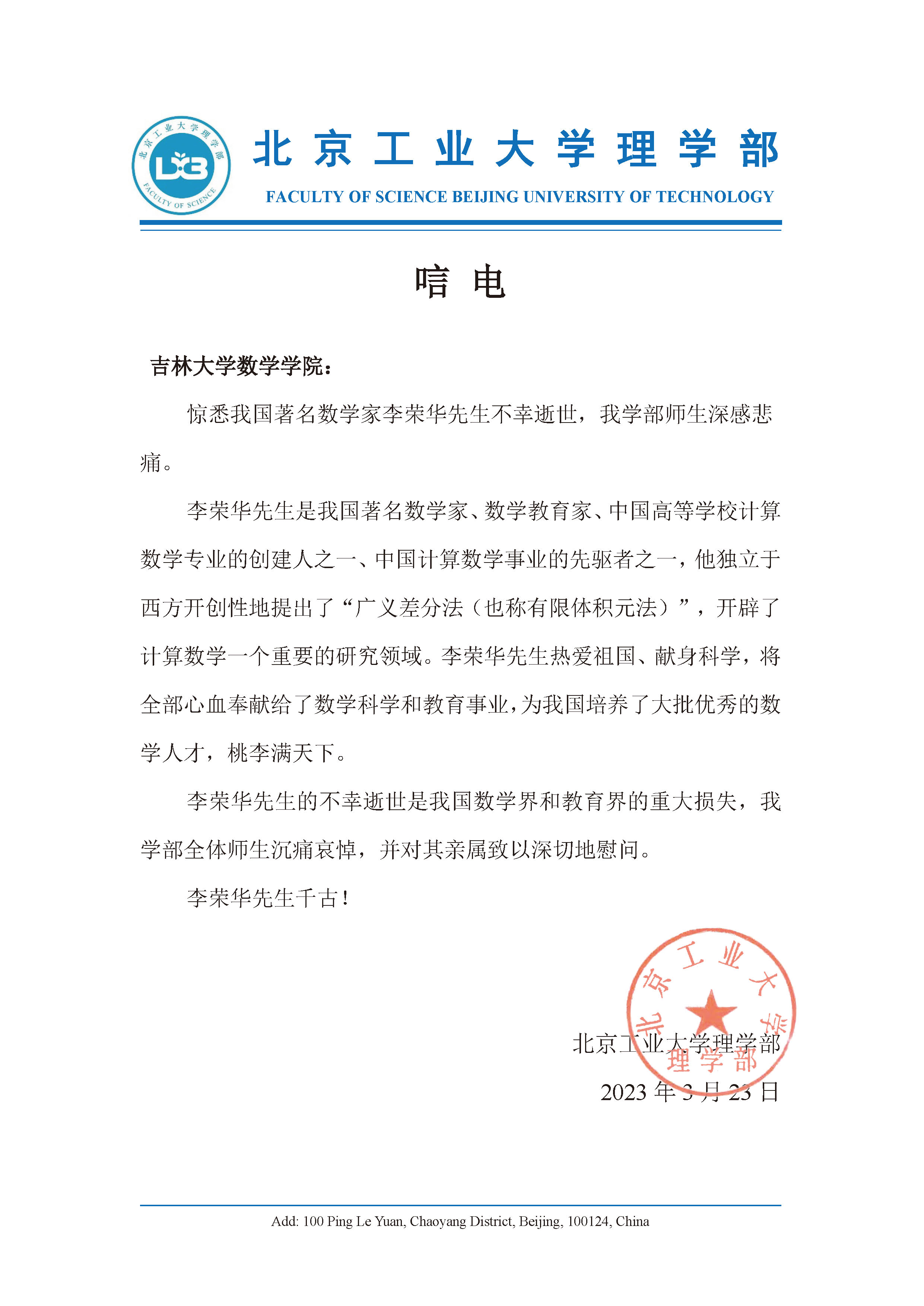 北京工业大学理学部唁电