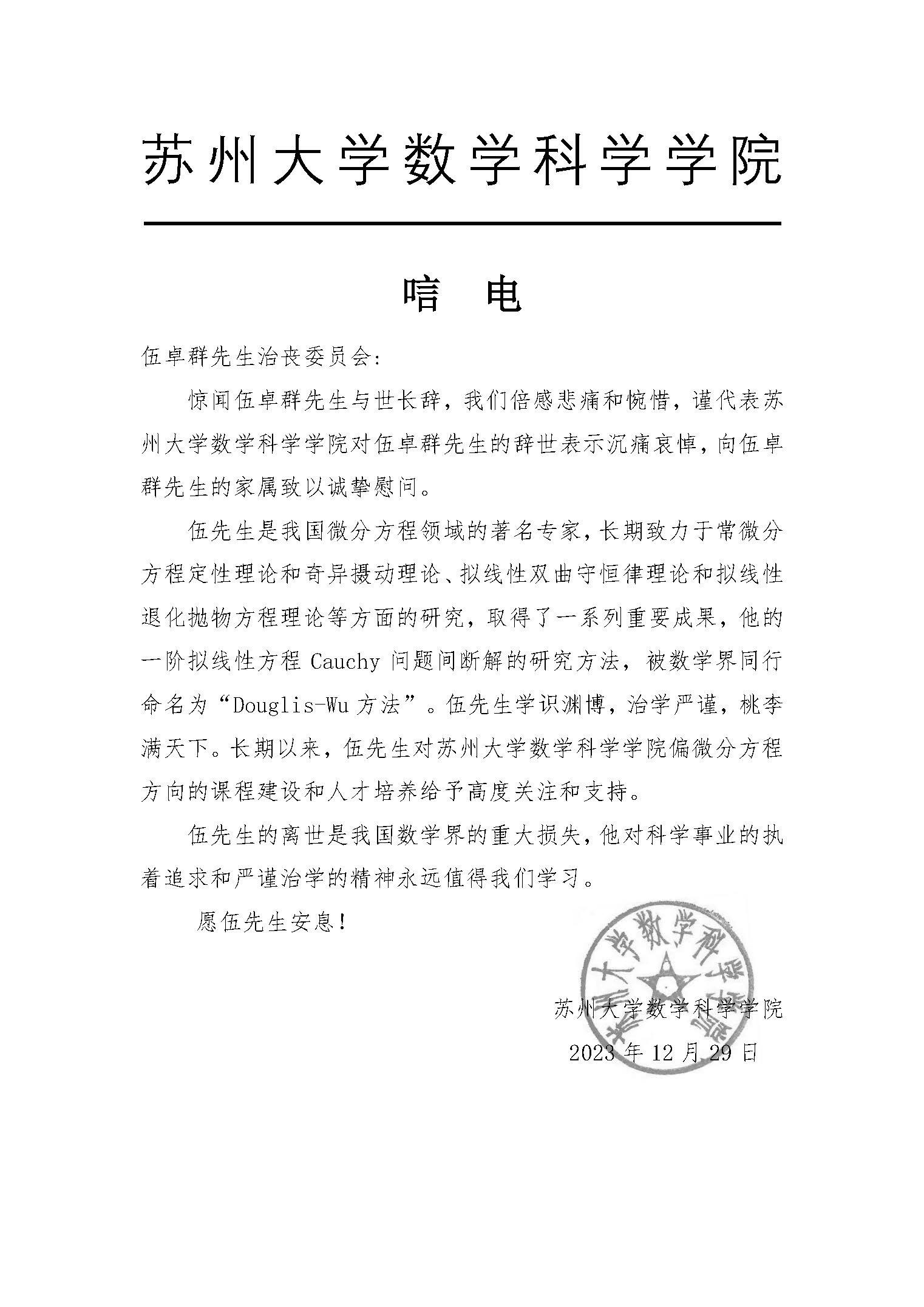 苏州大学数学科学学院唁电