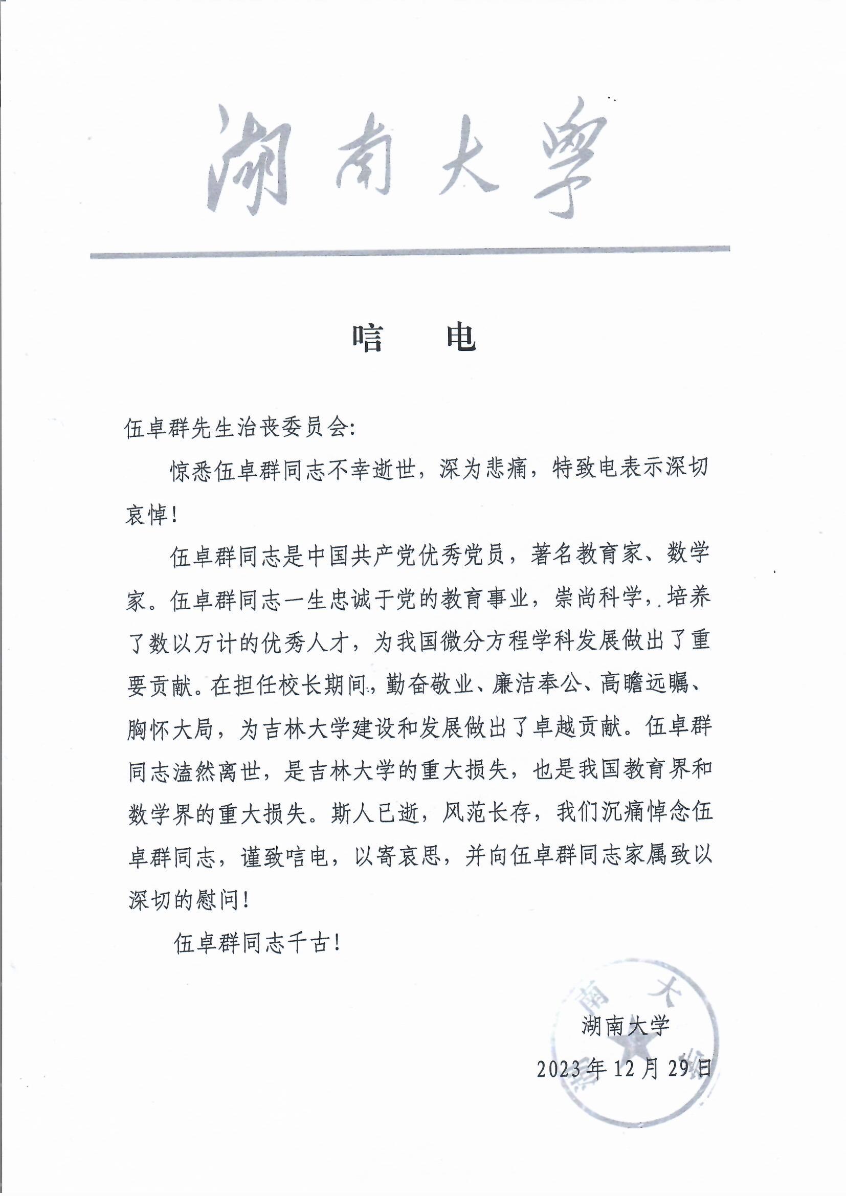 湖南大学唁电